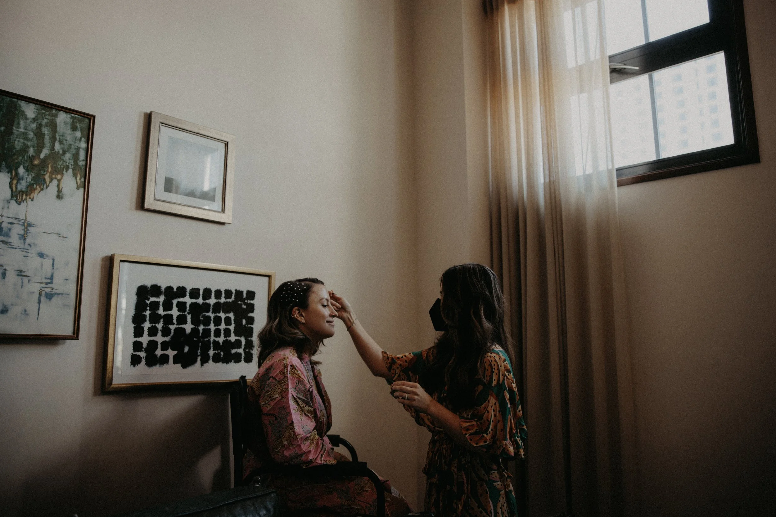I’m telling you - we have set up our hair and makeup kits virtually everywhere… on hotel beds, teeny tiny balconies, on the beach in the back of my car, in a MOVING VAN haha! We know how to be flexible and make it work, but in an ideal world, it’s absolutely lovely to have table space and a chair, next to natural window light for each artist on-site. Some clients initially think of bathrooms as a good place to set up, as there are mirrors and a nearby sink, but we usually gravitate towards facing our clients to a window and the natural light, and we always have handheld mirrors with us. Dining rooms and kitchens are usually a great option for hair and makeup!